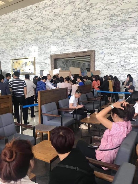 Những người này thậm chí còn mang theo cả đồ ăn, nước uống và ngồi ăn luôn trên sàn nhà tại khu vực sảnh chính toà nhà Charmvit Tower |