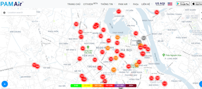 Hệ thống quan trắc theo thời gian thực PAMAir cũng ghi nhận hàng loạt các điểm đo có màu đỏ rực, AQI cao nhất ở ngưỡng 190. Các khu đô thị đông dân cư như khu đô thị Trung Văn (Tố Hữu) chỉ số AQI ở mức 190, khu đô thị Time City (Thanh Xuân) AQI ở mức 188, khu đô thị Linh đàm (Hoàng Mai) là 178....