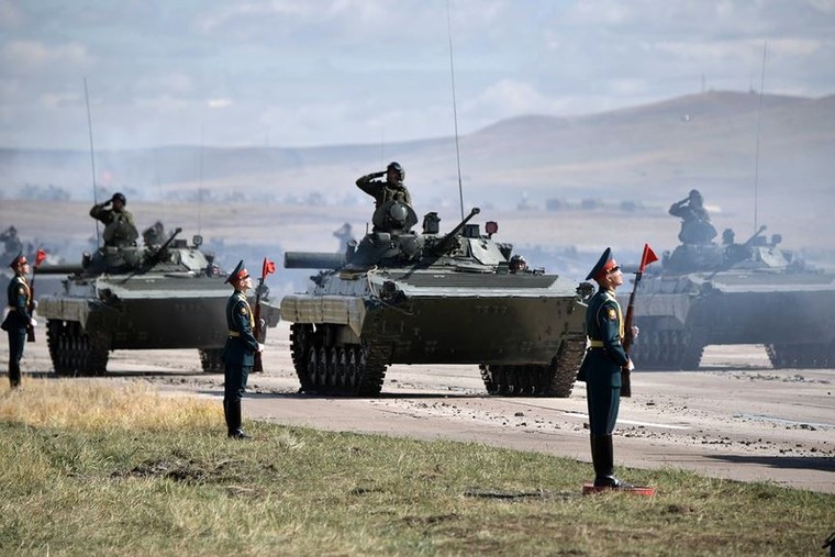 Cũng tại thao trường Tsugol, một lễ duyệt binh đã diễn ra với sự tham dự của lực lượng Nga, Trung Quốc, Mông Cổ. Ảnh: Sputnik