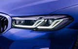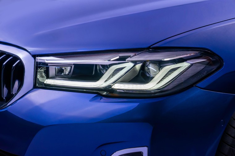 Đèn pha của BMW 5 Series mới nổi bật với các dải LED hình chữ L được bố trí cạnh nhau tạo nên đồ họa ánh sáng chính xác và hiện đại, đây là thiết kế tương tự như đàn anh BMW 7 Series. Cụm đèn pha LED thích ứng được trang bị tiêu chuẩn trên BMW 520i Luxury Line mới sở hữu chức năng mở rộng góc chiếu khi vào cua, phân tách từng luồng ánh sáng riêng biệt (BMW Selective Beam), cũng như tính năng tự động điều chỉnh thay đổi góc chiếu (High-beam Assistant) nhờ vào hệ thống camera theo dõi phương tiện đặt ở sau gương chiếu hậu bên trong xe. Ở hai phiên bản BMW 520i M Sport và BMW 530i M Sport, cụm đèn pha trước được nâng cấp vượt trội với công nghệ BMW Laserlight siêu sáng, đi kèm những cải tiến đáng kể. So với công nghệ LED thích ứng tiêu chuẩn, BMW Laserlight mang lại luồng ánh sáng có cường độ cao hơn khoảng 10 lần và khả năng chiếu sáng xa lên đến 650m. Diode laser sẽ được tự động kích hoạt và phản xạ luồng ánh sáng lên mặt đường chỉ khi xe đạt vận tốc từ 60 km/h trở lên. Ở dải vận tốc thấp hơn, ánh sáng LED tiêu chuẩn vẫn sẽ được sử dụng. Điều này không chỉ giúp gia tăng sự an toàn cho người lái và hành khách trên xe, đảm bảo không ảnh hướng đến các xe khác khi di chuyển. Đường viền màu xanh lam đặc trưng của công nghệ BMW Laserlight cũng là chi tiết góp phần tạo nên điểm nhấn vô cùng hấp dẫn ở đầu xe. Thêm vào đó, đèn báo rẽ trên BMW 5 Series mới cũng được tích hợp chung vào cụm đèn chiếu sáng ban ngày.