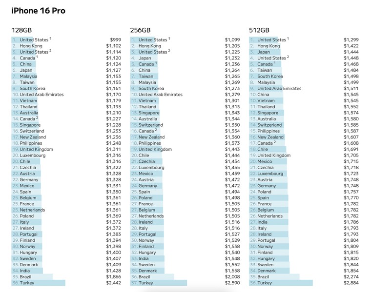 Bảng giá iPhone 16 Pro tại gần 40 quốc gia/vùng lãnh thổ