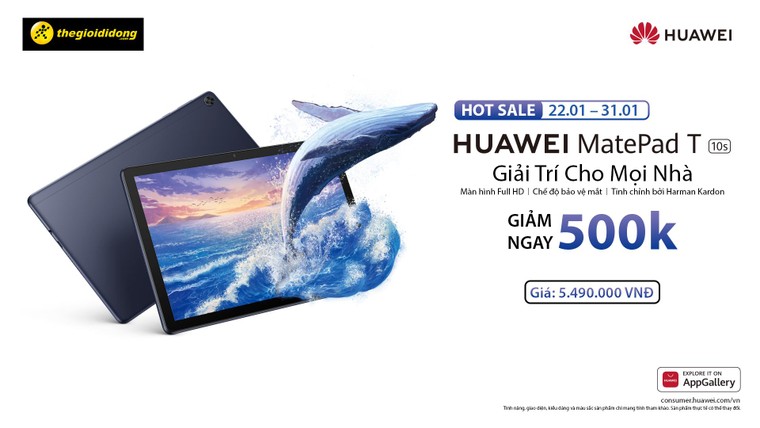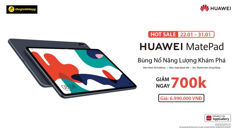 Từ ngày 22.01 đến ngày 31.01, khách hàng đặt mua sản phẩm tại cửa hàng Thế Giới Di Động, cửa hàng Trải nghiệm Huawei, các sàn thương mại điện tử Shopee, Lazada và Tiki sẽ được nhận ưu đãi giảm ngay 700.000 đồng cho Huawei MatePad và 500.000 đồng cho Huawei MatePad T10s.