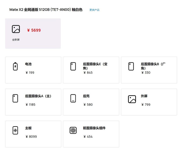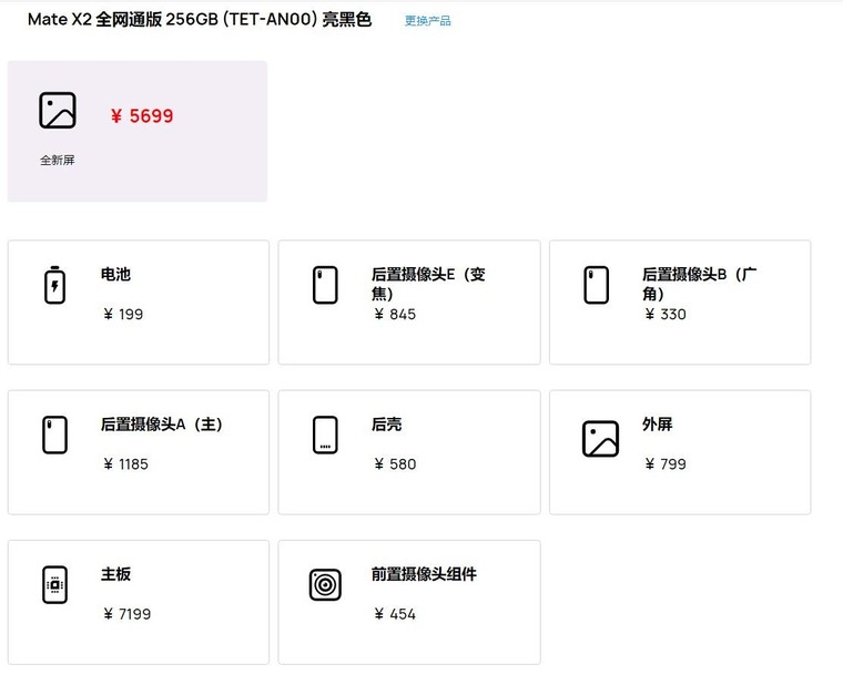Màn hình gập của Mate X2 không phải là thành phần đắt nhất của chiếc điện thoại, theo bảng giá để thay thế một chiếc màn hình mới cho Mate X2 sẽ mất 5.699 NDT (khoảng 20 triệu Đồng), còn để thay thế bo mạch chủ sẽ mất 7.199 NDT ( khoảng 25 triệu Đồng) hoặc 8.099 NDT ( khoảng 29 triệu Đồng) tùy thuộc vào phiên bản bộ nhớ 256GB hay 512GB.